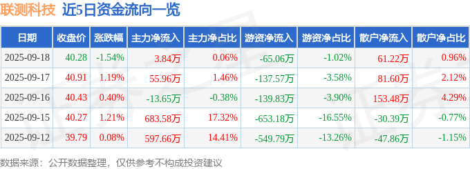 证券之星消息,截至2025年9月18日收盘,联测科技(688113)报收于40.28元,下跌1.54%,换手率2.41%,成交量1.55万手,成交额6387.19万元。