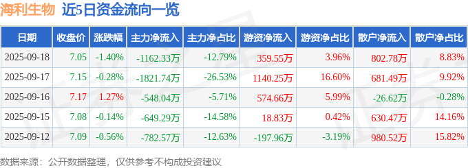 证券之星消息,截至2025年9月18日收盘,海利生物(603718)报收于7.05元,下跌1.4%,换手率1.98%,成交量12.85万手,成交额9088.45万元。