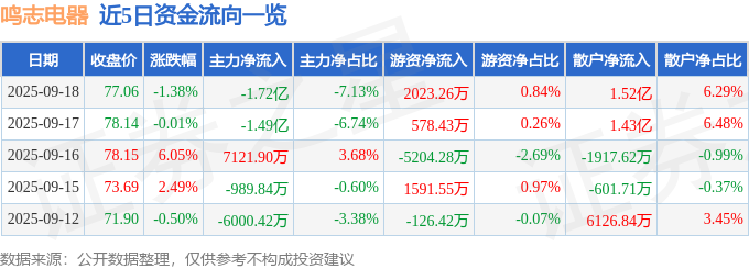 证券之星消息,截至2025年9月18日收盘,鸣志电器(603728)报收于77.06元,下跌1.38%,换手率7.36%,成交量30.81万手,成交额24.12亿元。