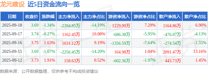 证券之星消息,截至2025年9月18日收盘,龙元建设(600491)报收于3.69元,下跌1.34%,换手率2.96%,成交量45.35万手,成交额1.69亿元。