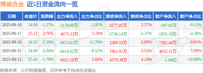 证券之星消息,截至2025年9月18日收盘,博威合金(601137)报收于24.8元,下跌1.27%,换手率4.37%,成交量35.53万手,成交额8.85亿元。