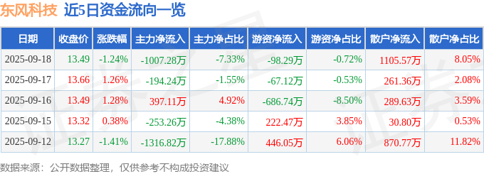 证券之星消息,截至2025年9月18日收盘,东风科技(600081)报收于13.49元,下跌1.24%,换手率1.81%,成交量10.02万手,成交额1.37亿元。