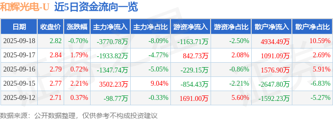 证券之星消息,截至2025年9月18日收盘,和辉光电(688538)报收于2.82元,下跌0.7%,换手率2.85%,成交量163.71万手,成交额4.66亿元。