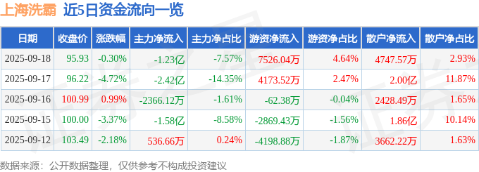 证券之星消息,截至2025年9月18日收盘,上海洗霸(603200)报收于95.93元,下跌0.3%,换手率9.56%,成交量16.78万手,成交额16.21亿元。