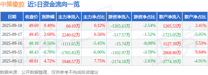 证券之星消息,截至2025年9月18日收盘,中策橡胶(603049)报收于49.69元,上涨0.49%,换手率11.72%,成交量9.94万手,成交额4.99亿元。