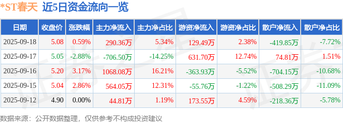 证券之星消息,截至2025年9月18日收盘,*ST春天(600381)报收于5.08元,上涨0.59%,换手率1.8%,成交量10.58万手,成交额5440.3万元。