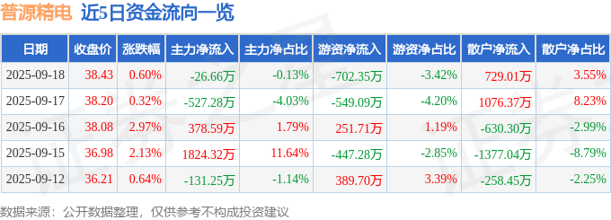 9月18日的资金流向数据方面,主力资金净流出26.66万元,占总成交额0.13%,游资资金净流出702.35万元,占总成交额3.42%,散户资金净流入729.01万元,占总成交额3.55%。
