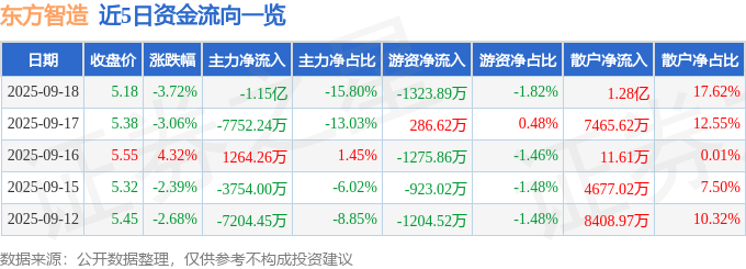 证券之星消息,截至2025年9月18日收盘,东方智造(002175)报收于5.18元,下跌3.72%,换手率10.89%,成交量139.06万手,成交额7.28亿元。