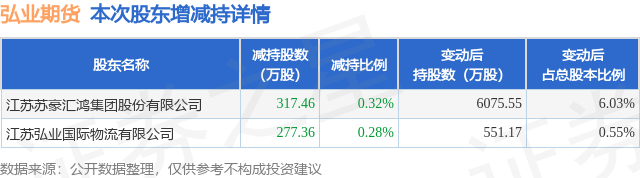 证券之星消息,9月18日弘业期货发布公告《弘业期货:关于控股股东之一致行动人权益变动后持股比例触及1%整数倍的提示性公告》,其股东江苏苏豪汇鸿集团股份有限公司、江苏弘业国际物流有限公司于2025年9月11日至2025年9月17日间合计减持594.82万股,占公司目前总股本的0.5902%,变动期间该股股价上涨3.94%,截止9月17日收盘报12.14元。