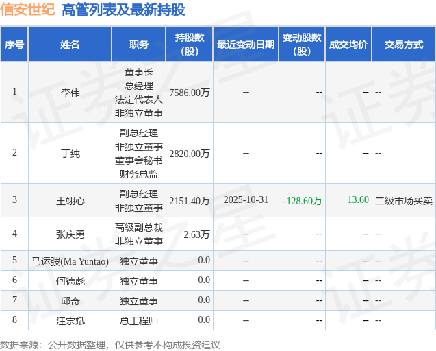信安世纪的高管列表及最新持股情况如下: