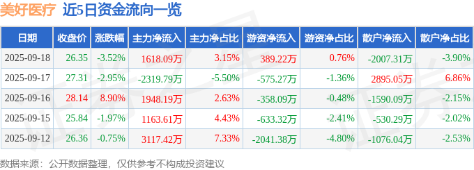 证券之星消息,截至2025年9月18日收盘,美好医疗(301363)报收于26.35元,下跌3.52%,换手率12.24%,成交量19.12万手,成交额5.14亿元。