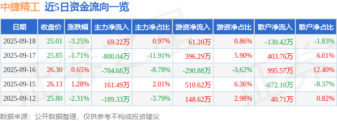 证券之星消息,截至2025年9月18日收盘,中捷精工(301072)报收于25.01元,下跌3.25%,换手率4.17%,成交量2.8万手,成交额7135.13万元。
