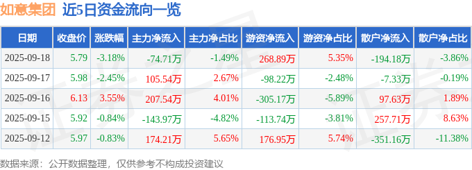 证券之星消息,截至2025年9月18日收盘,如意集团(002193)报收于5.79元,下跌3.18%,换手率3.27%,成交量8.57万手,成交额5026.9万元。