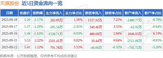 证券之星消息,截至2025年9月18日收盘,天原股份(002386)报收于5.2元,下跌3.17%,换手率2.46%,成交量31.98万手,成交额1.69亿元。