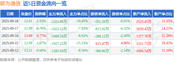 证券之星消息,截至2025年9月18日收盘,移为通信(300590)报收于12.61元,下跌2.93%,换手率4.9%,成交量17.35万手,成交额2.22亿元。