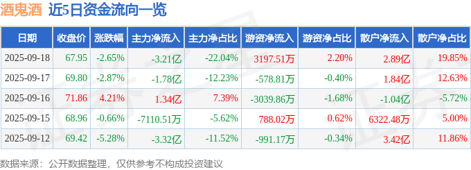 证券之星消息,截至2025年9月18日收盘,酒鬼酒(000799)报收于67.95元,下跌2.65%,换手率6.56%,成交量21.33万手,成交额14.56亿元。