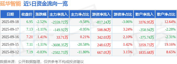 证券之星消息,截至2025年9月18日收盘,延华智能(002178)报收于6.95元,下跌2.52%,换手率5.32%,成交量37.88万手,成交额2.67亿元。