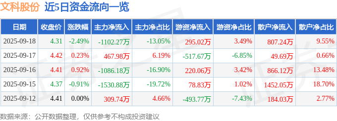 证券之星消息,截至2025年9月18日收盘,文科股份(002775)报收于4.31元,下跌2.49%,换手率4.36%,成交量19.34万手,成交额8448.59万元。