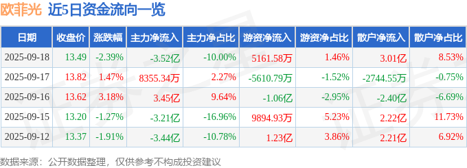 证券之星消息,截至2025年9月18日收盘,欧菲光(002456)报收于13.49元,下跌2.39%,换手率7.78%,成交量257.71万手,成交额35.25亿元。