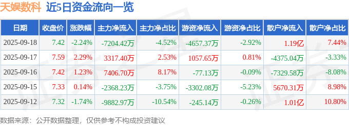 证券之星消息,截至2025年9月18日收盘,天娱数科(002354)报收于7.42元,下跌2.24%,换手率12.9%,成交量209.7万手,成交额15.94亿元。