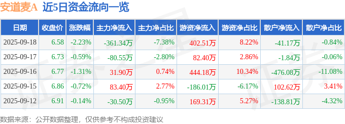 9月18日的资金流向数据方面,主力资金净流出361.34万元,占总成交额7.38%,游资资金净流入402.51万元,占总成交额8.22%,散户资金净流出41.17万元,占总成交额0.84%。