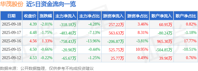 证券之星消息,截至2025年9月18日收盘,华茂股份(000850)报收于4.39元,下跌2.01%,换手率1.78%,成交量16.75万手,成交额7429.32万元。