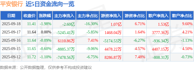 证券之星消息,截至2025年9月18日收盘,平安银行(000001)报收于11.41元,下跌1.98%,换手率0.71%,成交量138.62万手,成交额15.95亿元。