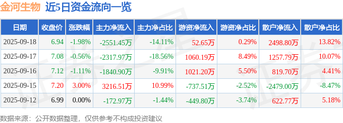 证券之星消息,截至2025年9月18日收盘,金河生物(002688)报收于6.94元,下跌1.98%,换手率3.45%,成交量25.86万手,成交额1.81亿元。
