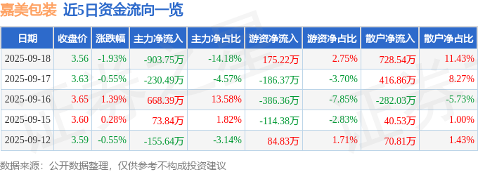 证券之星消息,截至2025年9月18日收盘,嘉美包装(002969)报收于3.56元,下跌1.93%,换手率1.87%,成交量17.79万手,成交额6372.13万元。