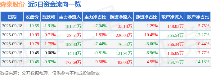 证券之星消息,截至2025年9月18日收盘,森泰股份(301429)报收于19.55元,下跌1.91%,换手率2.97%,成交量1.31万手,成交额2573.41万元。