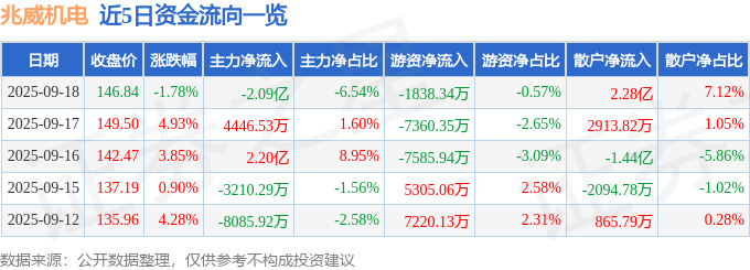 证券之星消息,截至2025年9月18日收盘,兆威机电(003021)报收于146.84元,下跌1.78%,换手率10.38%,成交量21.46万手,成交额31.99亿元。
