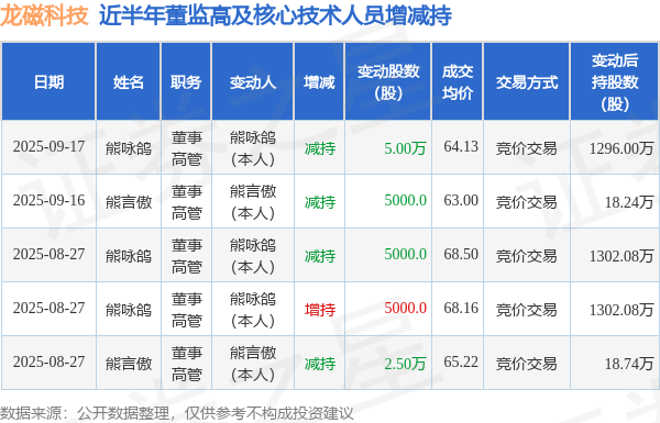 证券之星消息,根据9月18日市场公开信息、上市公司公告及交易所披露数据整理,龙磁科技(300835)最新董监高及相关人员股份变动情况:2025年9月17日公司董事,高管熊咏鸽共减持公司股份5.0万股,占公司总股本为0.0419%。变动期间公司股价上涨3.38%,9月17日当日收盘报64.79元。