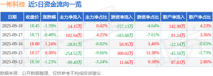 证券之星消息,截至2025年9月18日收盘,一彬科技(001278)报收于18.45元,下跌1.39%,换手率3.59%,成交量1.81万手,成交额3383.03万元。
