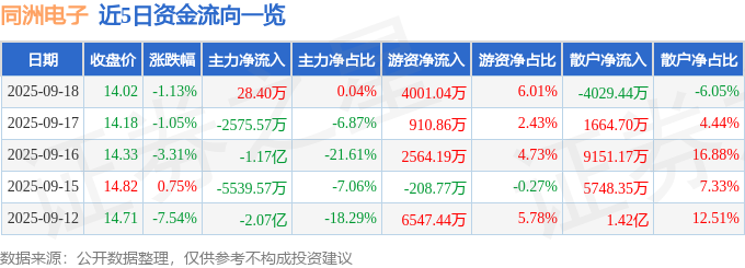 证券之星消息,截至2025年9月18日收盘,同洲电子(002052)报收于14.02元,下跌1.13%,换手率6.77%,成交量46.66万手,成交额6.66亿元。