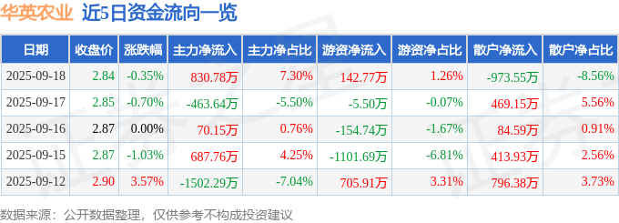 证券之星消息,截至2025年9月18日收盘,华英农业(002321)报收于2.84元,下跌0.35%,换手率1.88%,成交量39.93万手,成交额1.14亿元。