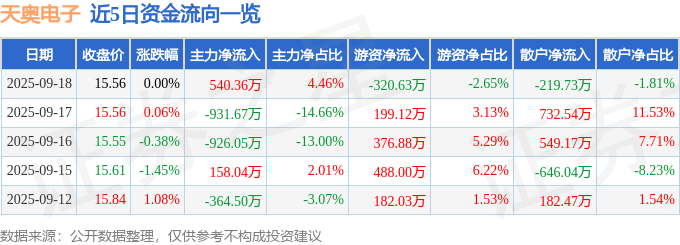 证券之星消息,截至2025年9月18日收盘,天奥电子(002935)报收于15.56元,上涨0.0%,换手率1.86%,成交量7.71万手,成交额1.21亿元。
