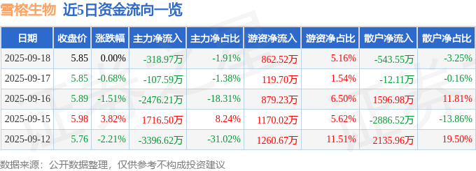 证券之星消息,截至2025年9月18日收盘,雪榕生物(300511)报收于5.85元,上涨0.0%,换手率5.47%,成交量28.27万手,成交额1.67亿元。