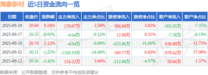 9月18日的资金流向数据方面,主力资金净流入179.87万元,占总成交额2.34%,游资资金净流入386.08万元,占总成交额5.02%,散户资金净流出565.95万元,占总成交额7.35%。