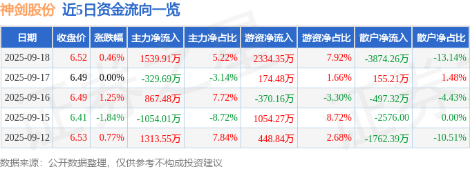 证券之星消息,截至2025年9月18日收盘,神剑股份(002361)报收于6.52元,上涨0.46%,换手率5.51%,成交量44.57万手,成交额2.95亿元。