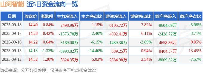 证券之星消息,截至2025年9月18日收盘,山河智能(002097)报收于14.4元,上涨0.84%,换手率13.79%,成交量147.88万手,成交额21.64亿元。