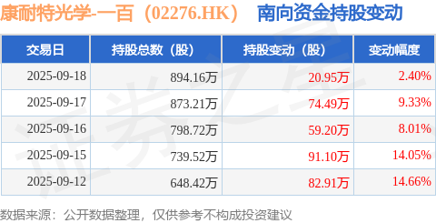 证券之星消息,9月18日南向资金增持20.95万股康耐特光学-一百(02276.HK)。近5个交易日中,获南向资金增持的有5天,累计净增持328.65万股。截至目前,南向资金持有康耐特光学-一百(02276.HK)894.16万股,占公司已发行普通股的1.85%。