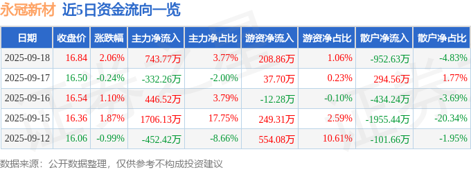 9月18日的资金流向数据方面,主力资金净流入743.77万元,占总成交额3.77%,游资资金净流入208.86万元,占总成交额1.06%,散户资金净流出952.63万元,占总成交额4.83%。