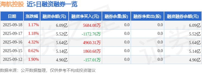 海航控股融资融券信息显示,融资方面,当日融资买入1.79亿元,融资偿还1.22亿元,融资净买入5684.08万元。融券方面,融券卖出0.0股,融券偿还0.0股,融券余量0.0股,融券余额0.0万元。融资融券余额6.09亿元。
