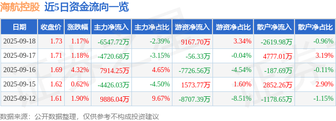 证券之星消息,截至2025年9月18日收盘,海航控股(600221)报收于1.73元,上涨1.17%,换手率4.72%,成交量1553.07万手,成交额27.43亿元。