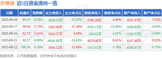 证券之星消息,截至2025年9月18日收盘,安博通(688168)报收于89.29元,下跌8.92%,换手率6.56%,成交量5.04万手,成交额4.78亿元。