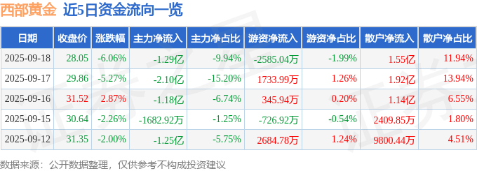 证券之星消息,截至2025年9月18日收盘,西部黄金(601069)报收于28.05元,下跌6.06%,换手率5.13%,成交量45.53万手,成交额12.97亿元。
