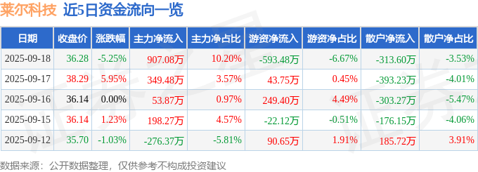 证券之星消息,截至2025年9月18日收盘,莱尔科技(688683)报收于36.28元,下跌5.25%,换手率1.55%,成交量2.4万手,成交额8891.81万元。