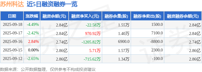 苏州科达融资融券信息显示,融资方面,当日融资买入2364.04万元,融资偿还2386.62万元,融资净偿还22.58万元。融券方面,融券卖出2100.0股,融券偿还600.0股,融券余量1.55万股,融券余额12.54万元。融资融券余额2.84亿元。