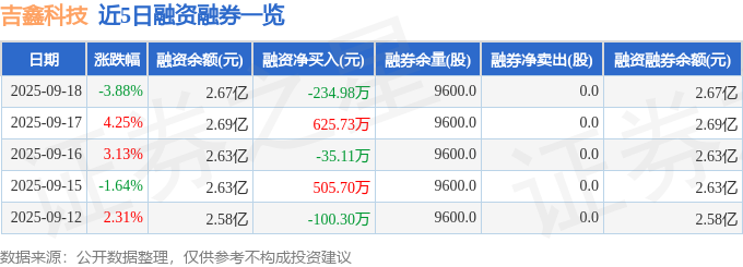 吉鑫科技融资融券信息显示,融资方面,当日融资买入7157.9万元,融资偿还7392.88万元,融资净偿还234.98万元。融券方面,融券卖出0.0股,融券偿还0.0股,融券余量9600.0股,融券余额4.75万元。融资融券余额2.67亿元。
