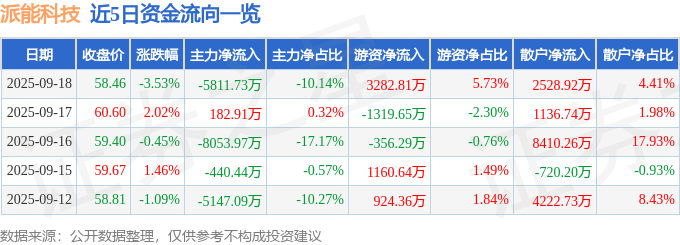 证券之星消息,截至2025年9月18日收盘,派能科技(688063)报收于58.46元,下跌3.53%,换手率3.94%,成交量9.66万手,成交额5.73亿元。